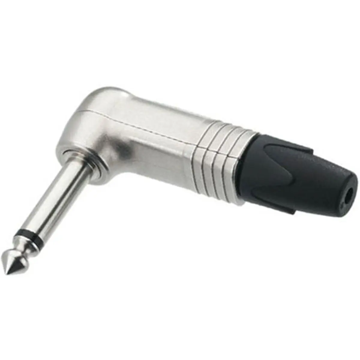 Conector jack mono de 6.35 mm, macho, com montagem por solda e orientação a 90°, adequado para cabos com diâmetro entre 4 e 7 mm. Os contactos são latão niquelado e o invólucro é zinco fundido com revestimento de níquel, proporcionando durabilidade e resistência. Ideal para aplicações de guitarra, cabos de áudio, cabos snake, alto-falantes, amplificadores e mesas de mistura, oferecendo encaixe estável e fiabilidade em estúdio, palco e setups ao vivo.