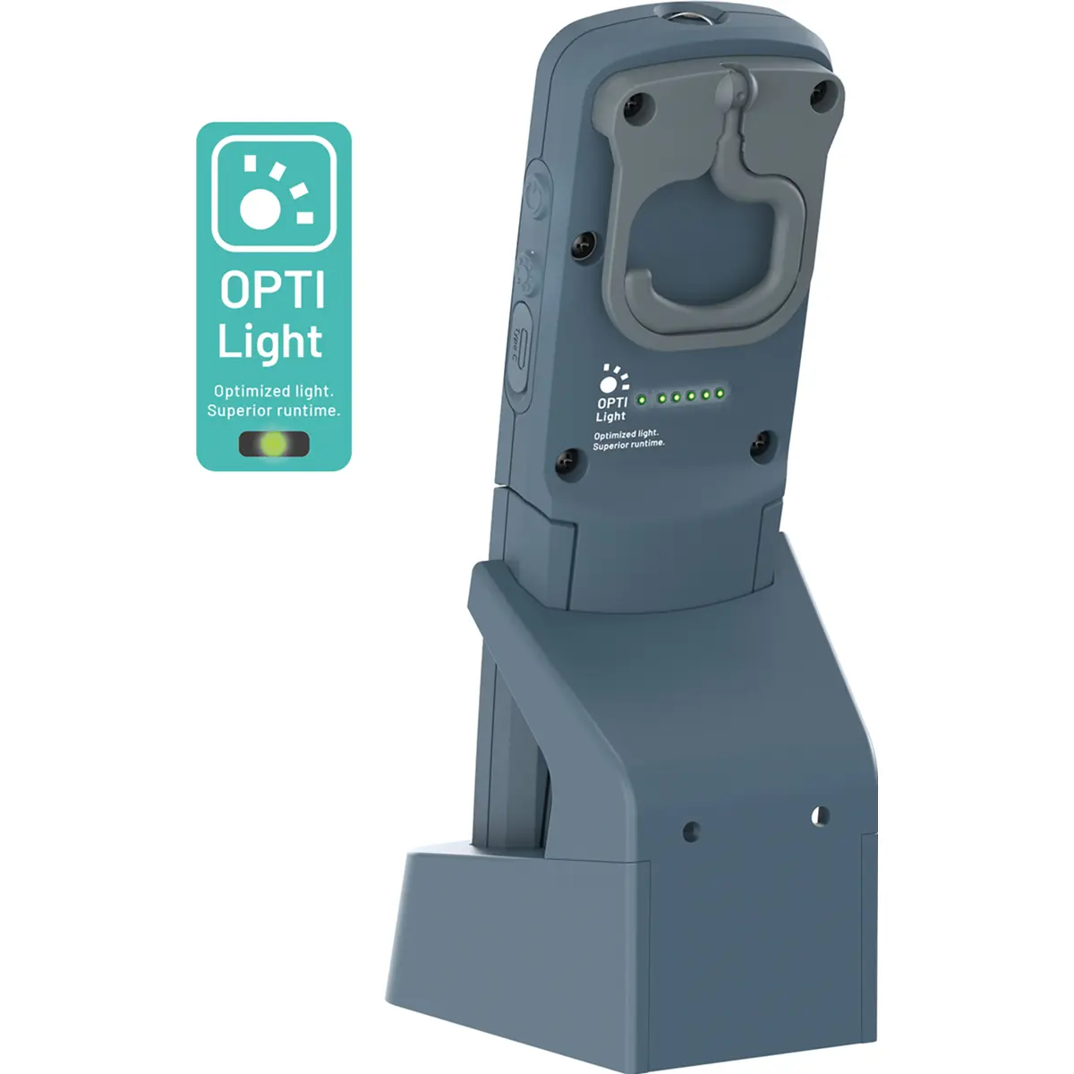A configuração OPTILight fornece a iluminância (LUX) necessária em situações típicas de trabalho, garantindo luz e tempo de funcionamento otimizados com um simples toque. Esta lanterna LED recarregável proporciona um desempenho constante de saída de lúmenes medido de acordo com a norma europeia EN 13032-1.