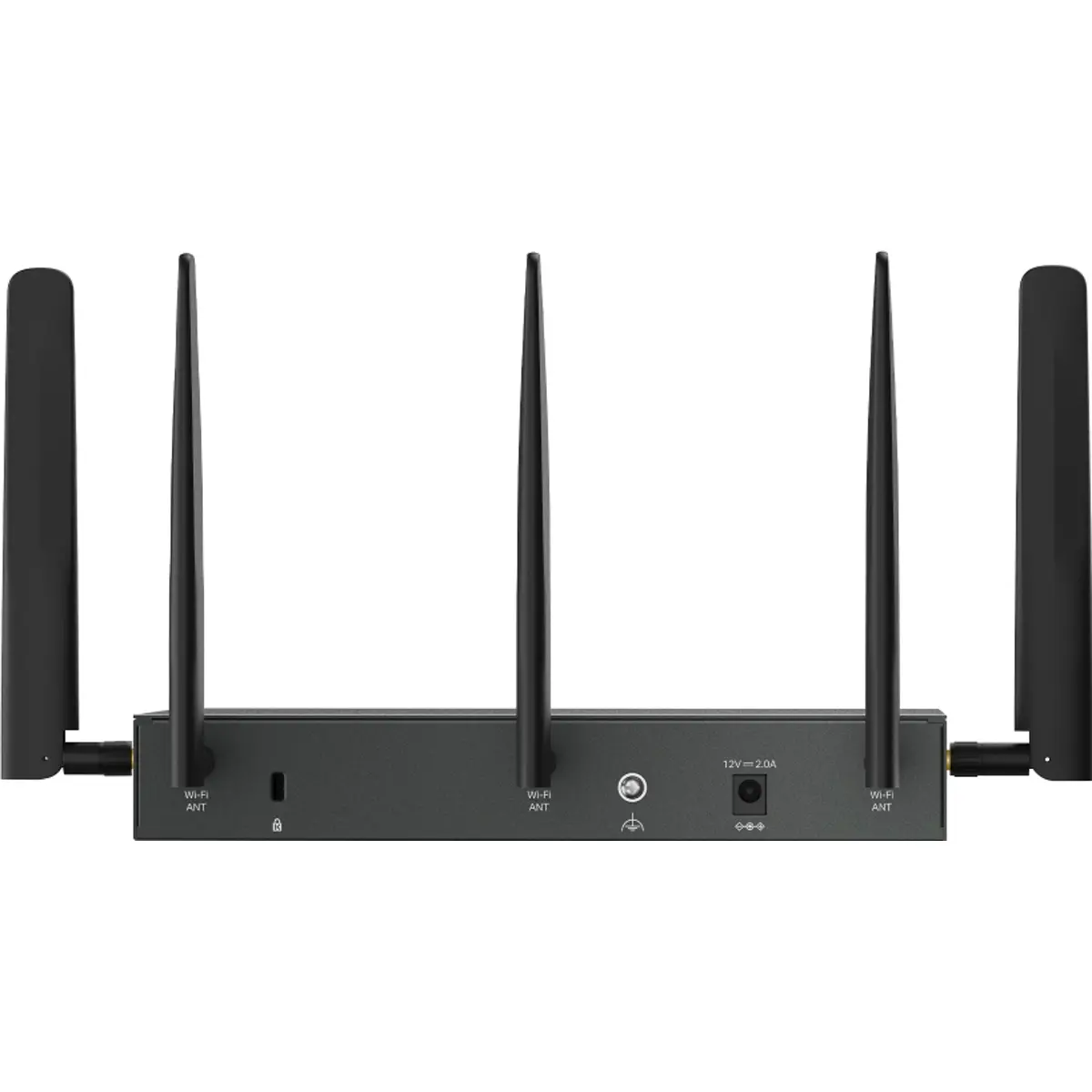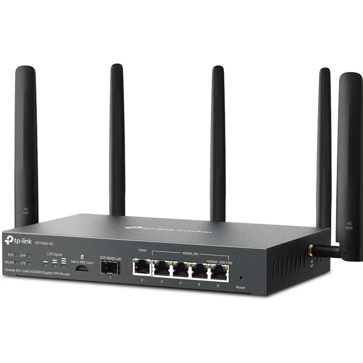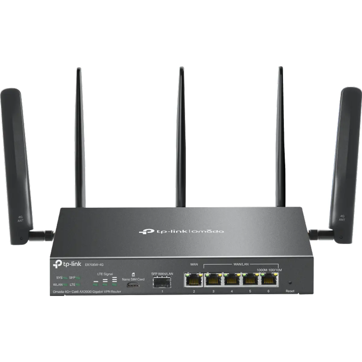 O Omada ER706W‑4G é um router VPN de alto desempenho, integrado na plataforma Omada SDN da TP‑Link, concebido para proporcionar conectividade móvel robusta, segurança reforçada e gestão centralizada através da nuvem. Equipado com tecnologia 4G+ Cat6, permite ligação à Internet até 300 Mbps por intermédio de um cartão Nano SIM, ideal como alternativa ou complemento à conexão fixa. Dispõe de Wi‑Fi 6 (AX3000) em banda dupla, oferecendo velocidades até 2402 Mbps em 5 GHz e 574 Mbps em 2,4 GHz, assegurando cobertura e desempenho com as cinco antenas de alto ganho.