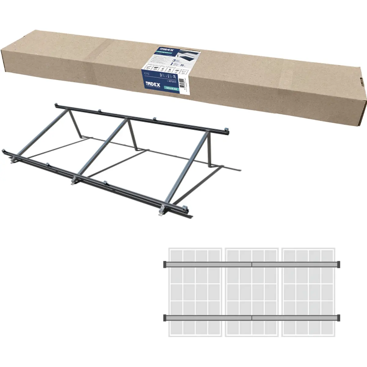 O kit de montagem inclui todos os componentes necessários para instalar até 3 painéis solares com dimensão até 1150mm de largura (comprimento do perfil do kit 3,75m), conforme o sistema de montagem triangulares ST-PSC.