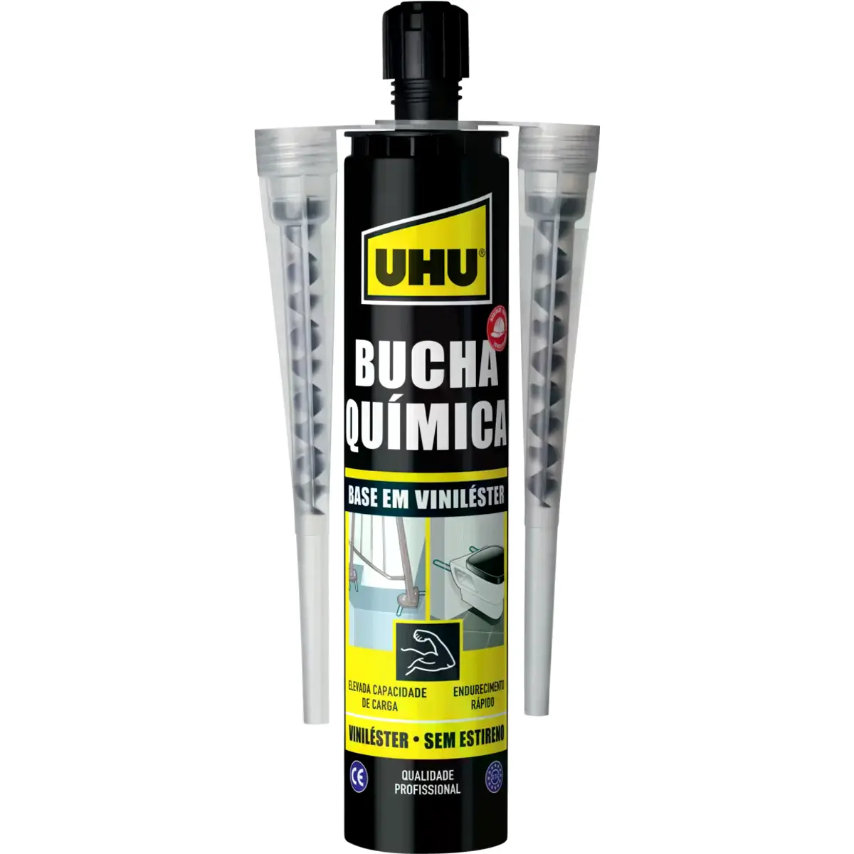 UHU Bucha Química 300ml: cola de endurecimento rápido à base de vinilester, sem estireno. Ideal para fixação pesada em diversos materiais de construção, oferecendo elevada capacidade de carga, resistência à humidade e à corrosão.