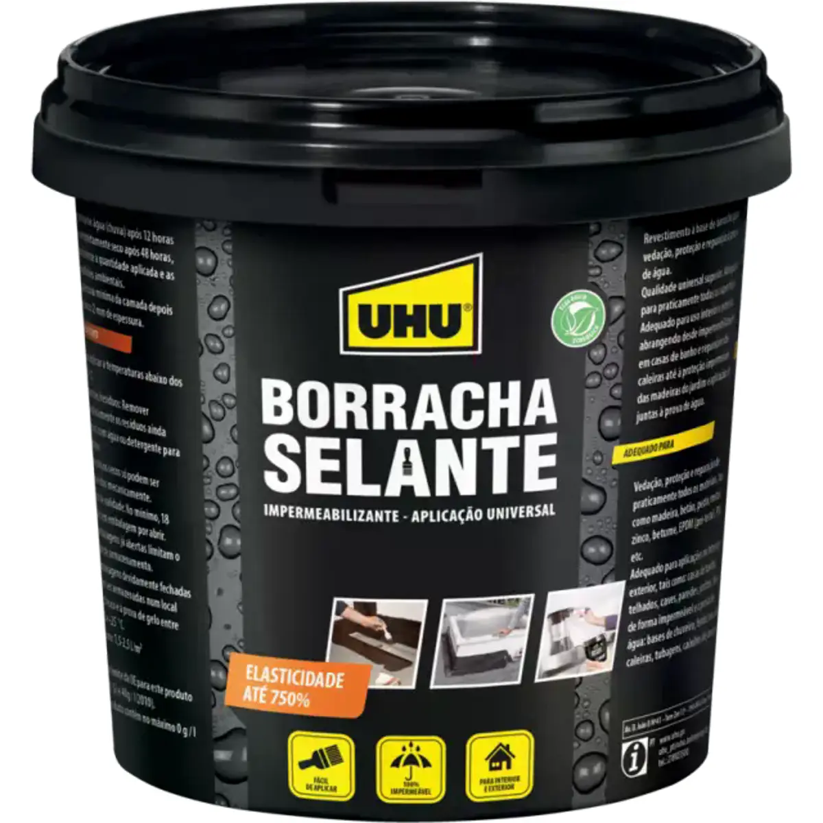 UHU Borracha Selante: revestimento à base de borracha para vedação à prova de água, proteção e reparação. Qualidade superior, universal e adequada para praticamente todas as superfícies. Ideal para aplicações no interior e exterior, desde a impermeabilização de casas de banho até à reparação de caleiras. Para uma vedação mais resistente, utilize a Borracha Selante Banda Têxtil em combinação com este produto.