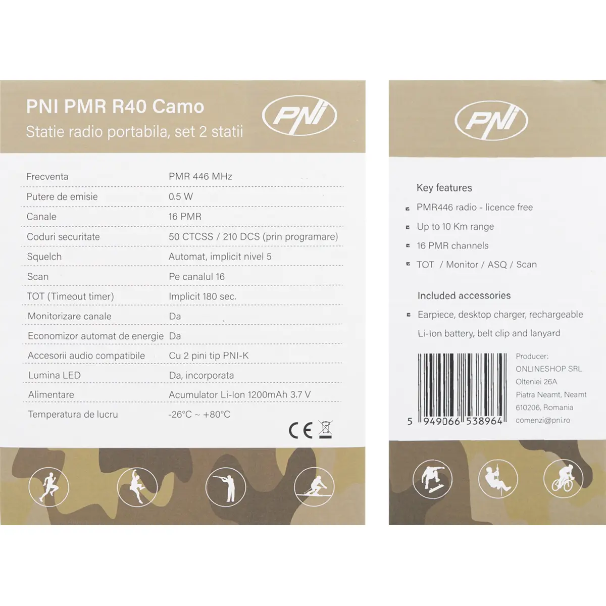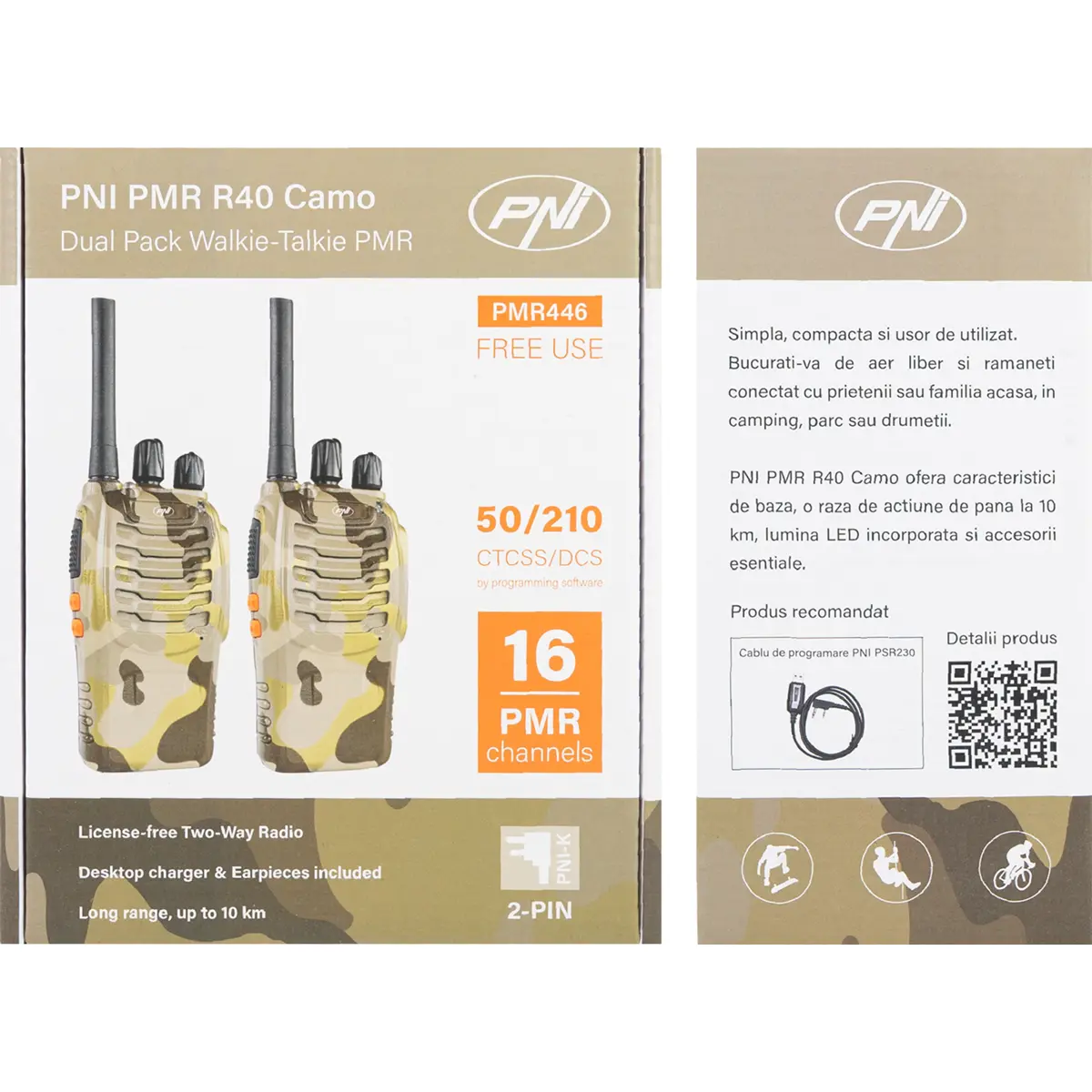 O conjunto PNI PMR R40 Camo inclui duas estações rádio portáteis PMR446, ideais para utilização em atividades ao ar livre, trabalhos em equipa ou comunicação pessoal. O uso da frequência PMR446 não exige licença e está autorizado em grande parte da Europa.