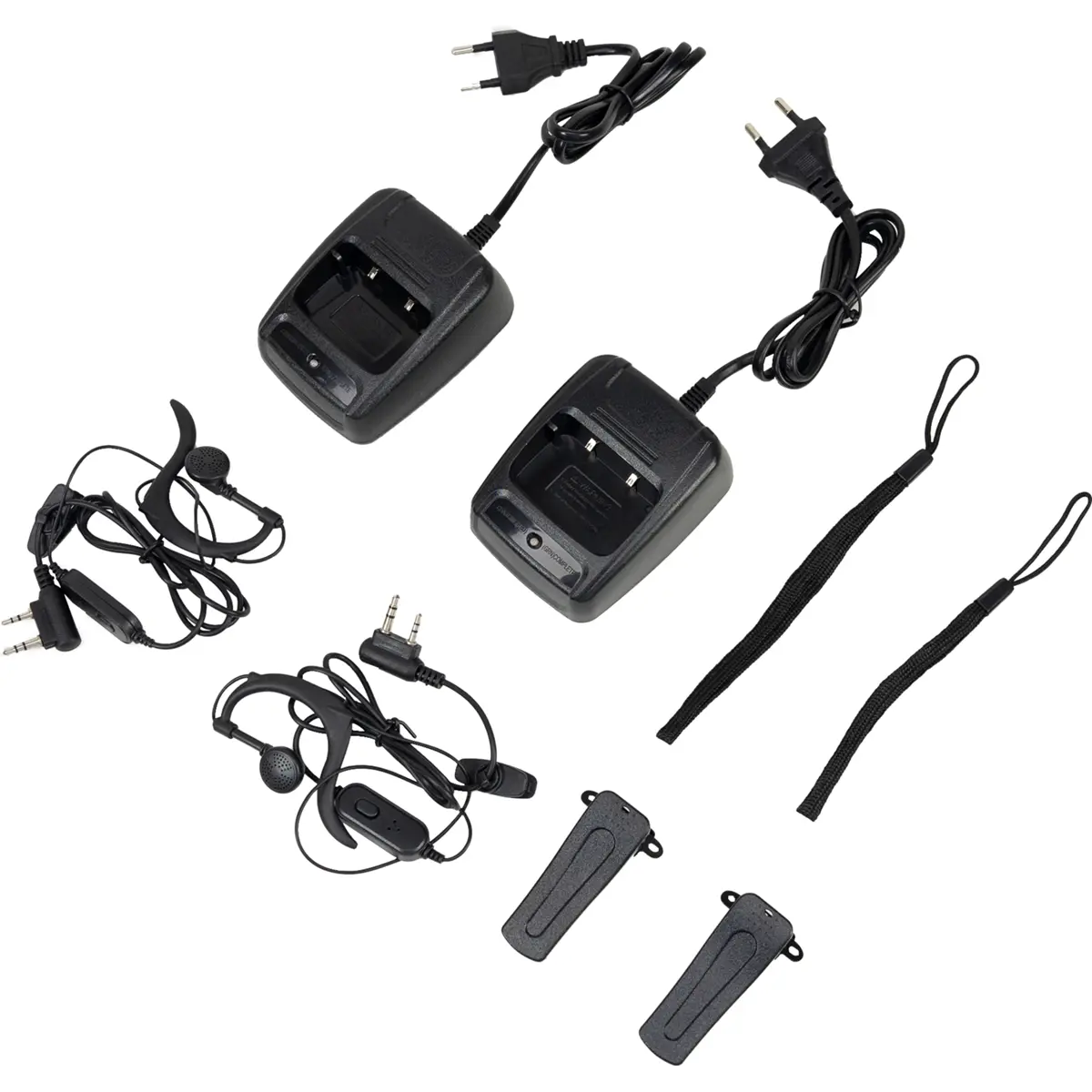 Conjunto de rádio PMR446 sem licença com duas estações portáteis, 16 canais (8 mais 8 pré-programados). Alcança até 10 km em campo aberto com potência de emissão de 0,5 W. Inclui auscultadores com microfone e PTT/VOX, LED de iluminação de emergência e monitorização de canal; squelch automático com TOT predefinido para 180 segundos. Pode ser programado por software, com códigos de segurança 50 CTCSS e 104 DCS programáveis. Bateria Li-Ion de 1200 mAh oferece até 8 horas de autonomia; carregadores de secretária incluídos. Ideal para atividades ao ar livre e comunicação em equipa.