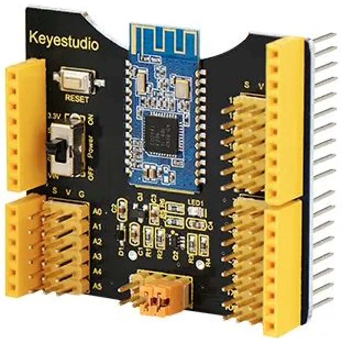 O shield integra um módulo Bluetooth HM-10 que possibilita comunicação sem fios de longo alcance, ideal para projetos IoT, automação e controlo remoto via smartphone. Inclui ainda botões e jumpers que permitem configurar e gerir facilmente a comunicação serial com a placa.