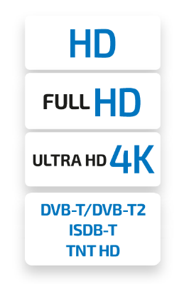 • Resoluções suportadas: HD (720p), Full HD (1080i / 1080p), Ultra HD (4K / 2160p)
